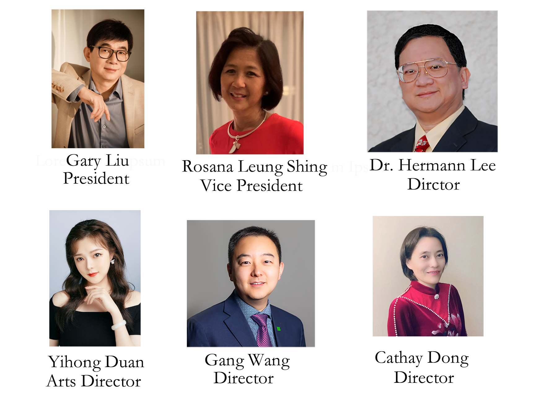 Second Row: Yihong Duan, Gang Wang, Cathay DongManitoba Great Wall Performing Arts Inc. is an independent non-profit amateur cultural performance organization. Its membership consists of local Chinese immigrants, Chinese-Canadian citizens and student volunteers who share a common interest in the Chinese performing arts and are dedicated to community growth.